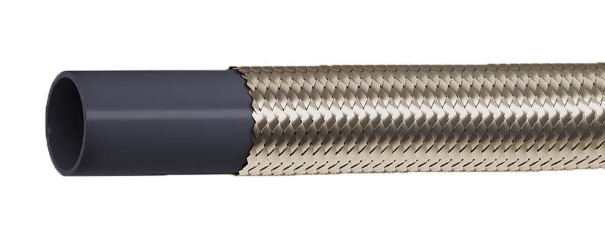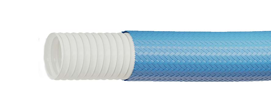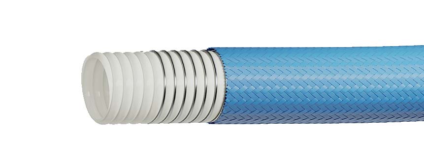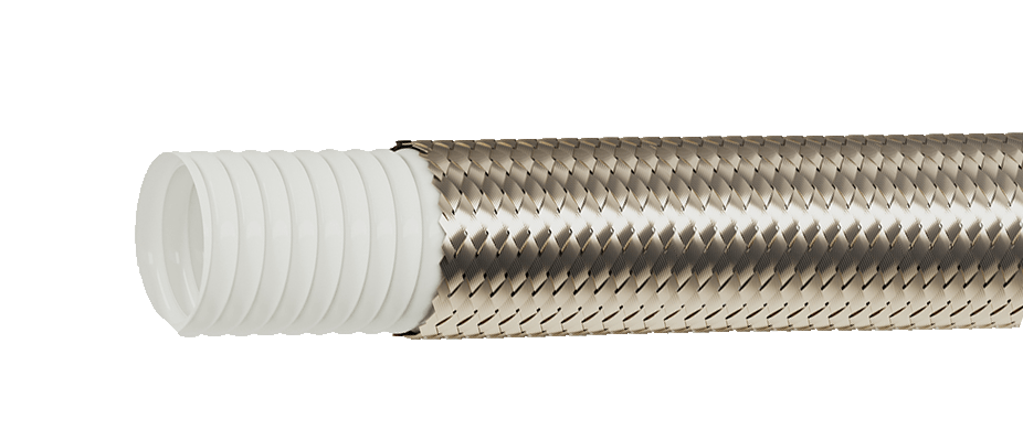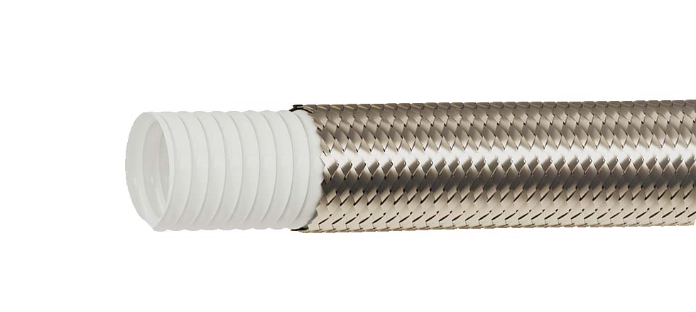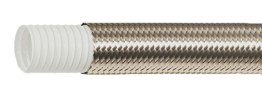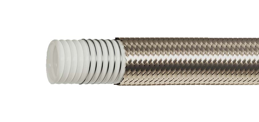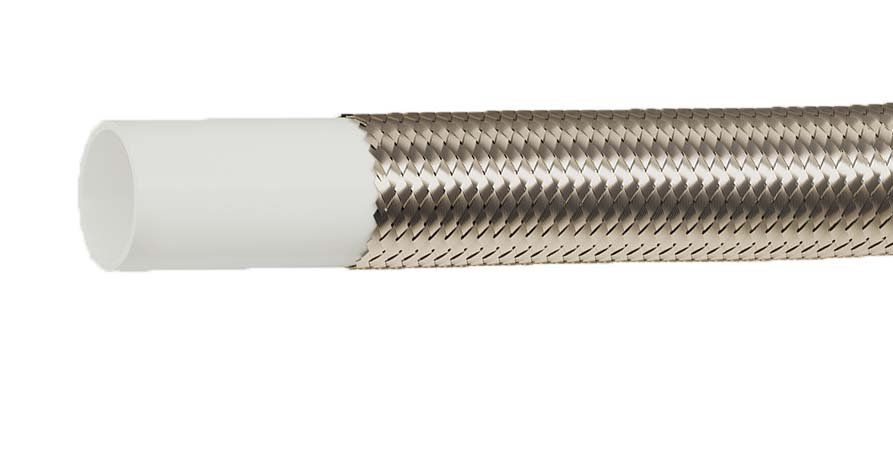 Manguera de PTFE (Teflón) liso con revestimiento de malla de acero inoxidable brindando una ligera flexibilidad. Con una amplia gama de aplicaciones y facilidad de limpieza.